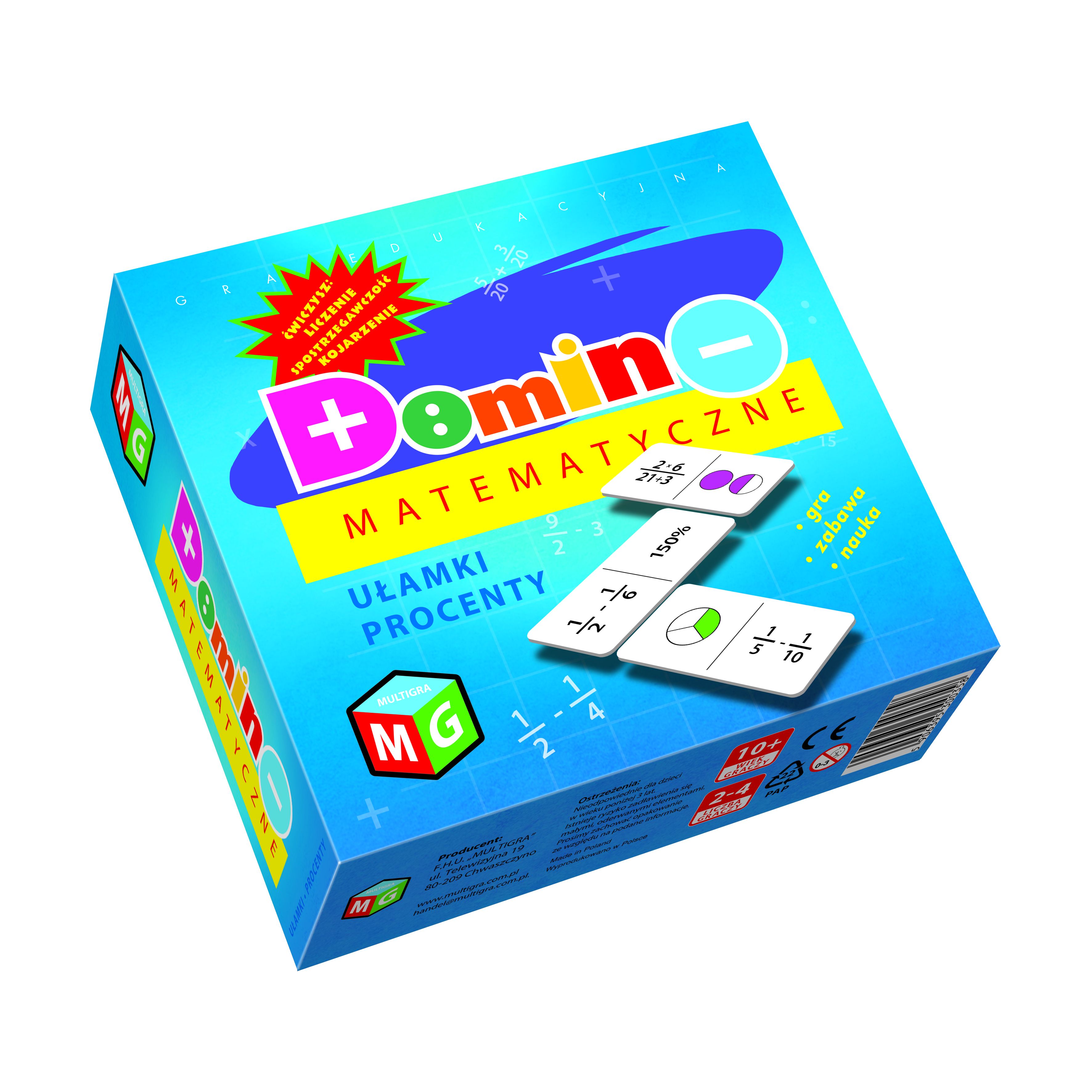 DOMINO MATEMATYCZNE UŁAMKI, PROCENTY - to wersja domina w formie działań matematycznych - działań na ułamkach i różnej prezentacji tej samej wartości w zapisie procentowym, ułamkowym i graficznym. Zasady gry wyglądają podobnie do zwykłego domina, z tą jednak róznicą, że gracze muszą połączyć ze sobą tę samą wartość w różnym zapisie. Gra ćwiczy spostrzegawczość oraz umiejętność szybkiego liczenia, jest dobrą, emocjonującą zabawą zarówno dla dzieci jak i dorosłych. Zawartość opakowania: 28 tabliczek domina, instrukcja.