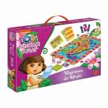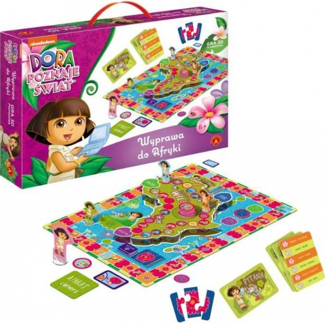 Dora postanowiła wybrać się na wycieczkę do Afryki. Dziewczynka nie jest zwykłą turystką i ma przed sobą odpowiedzialne zadanie: musi zdobyć aparat, sfotografować określone afrykańskie zwierzęta, a z wykonanych zdjęć zrobić wystawy w trzech różnych miastach kontynentu. Pomóż Dorze w podróży. Razem powędrujcie przez dżunglę i sawanny, przygotujcie się na spotkania z dzikimi zwierzętami oraz przypomnijcie sobie rozmaite angielskie słówka, których znajomość pomoże wam w podróży. Wygra osoba, która jako pierwsza dotrze na metę po zorganizowaniu trzech wystaw. Zawartość pudełka: plansza, 5 elementów podestu, 4 pionki, 4 podstawki, kostka, 12 żetonów zwierząt, 7 kart spotkań, 25 kart pytań, 4 puzzle z aparatem, instrukcja.