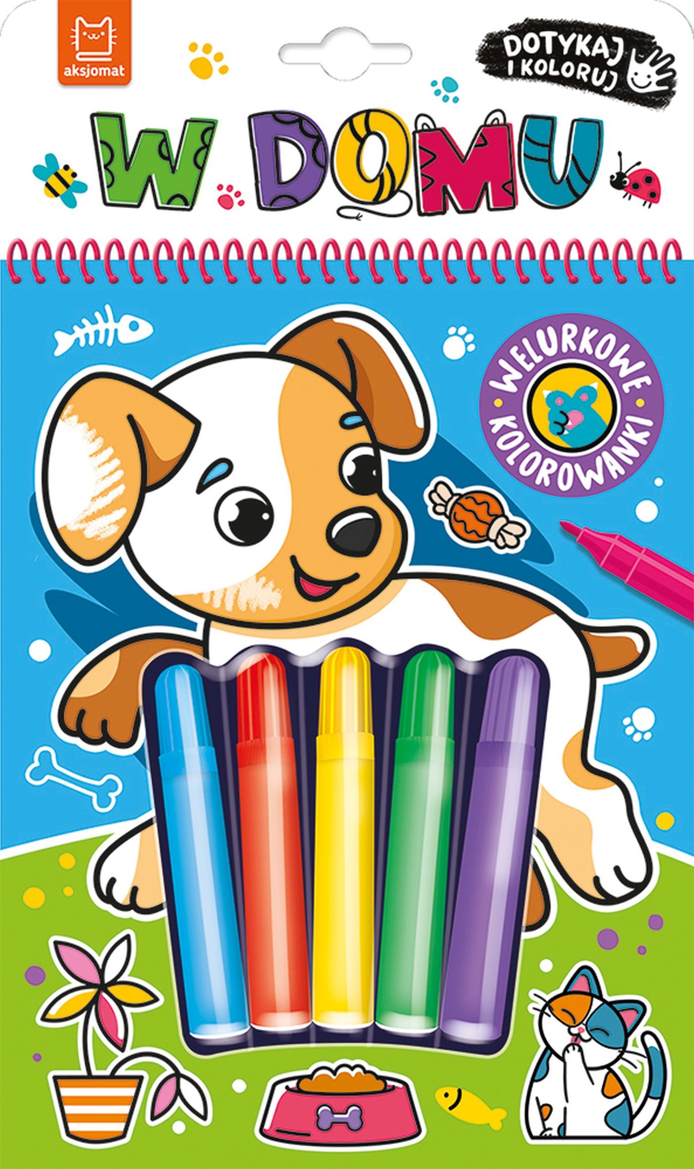 Dotykaj i koloruj. W domu to kolorowanka sensoryczna z dołączonymi pisakami. Tło obrazków pokrywa czarny welur, który podkreśla głębię kolorów, zapewnia wrażenia sensoryczne i ogranicza wychodzenie poza linię. Małych fanów i fanki zwierząt czeka spotkanie z naszymi pupilami. W tym gronie znajdą się ulubieńcy dzieci: kotek, chomik, piesek, żółw, papuga, królik, kameleon, rybka. Dzieci nie tylko pokolorują 8 uroczych rysunków. Przeczytają również wierszyki o zwierzętach z ilustracji. A dzięki perforacji pokolorowaną pracę mogą oderwać, włożyć do ramki i podarować w prezencie lub ozdobić nią pokój.