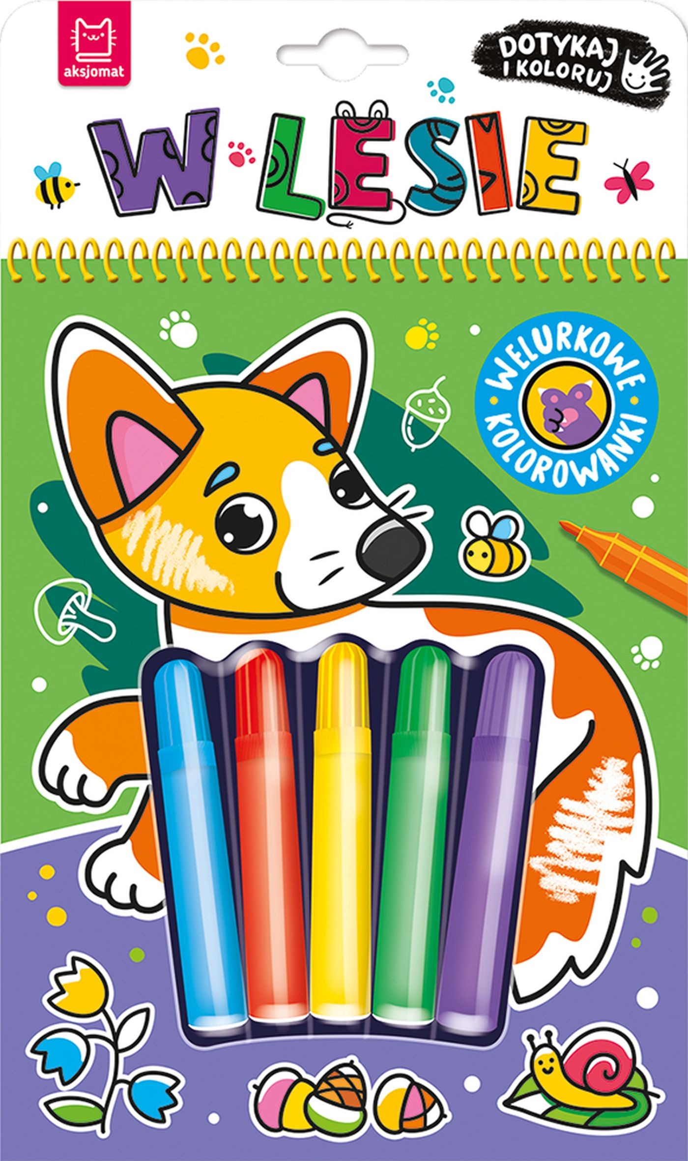 Dotykaj i koloruj. W lesie to kolorowanka sensoryczna z dołączonymi pisakami. Tło obrazków pokrywa czarny welur, który podkreśla głębię kolorów, zapewnia wrażenia sensoryczne i ogranicza wychodzenie poza linię. Małych fanów i fanki zwierząt czeka spotkanie z mieszkańcami lasu. W gronie leśnych zwierząt w książce znajdują się: borsuk, dzik i sowa, bobry, niedźwiedź, jeleń, wilk i nietoperze, wiewiórki, zajączek. Dzieci nie tylko pokolorują 8 uroczych rysunków. Przeczytają również wierszyki o zwierzętach z ilustracji. A dzięki perforacji pokolorowaną pracę mogą oderwać, włożyć do ramki i podarować w prezencie lub ozdobić nią pokój.