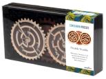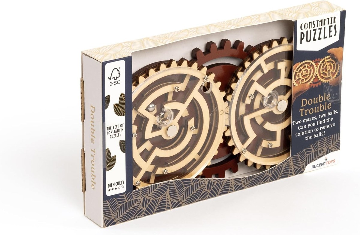 Celem łamigłówki jest wyciągnięcie dwóch kulek, dokładnie w tym samym czasie. Każde z kół zębatych ma znak na drewnianej obręczy. Obróć je w taki sposób, aby znalazły się one obok siebie. Wrzuć kulki przez wyprofilowane otwory w kształcie litery ""C"" i rozpocznij zabawę! Ponieważ koła zębate poruszają się w tym samym czasie, krok do przodu na jednym, może być krokiem w tył na drugim. Spróbuj dotrzeć do obu wyjść albo kulki już na zawsze pozostaną w labiryncie!