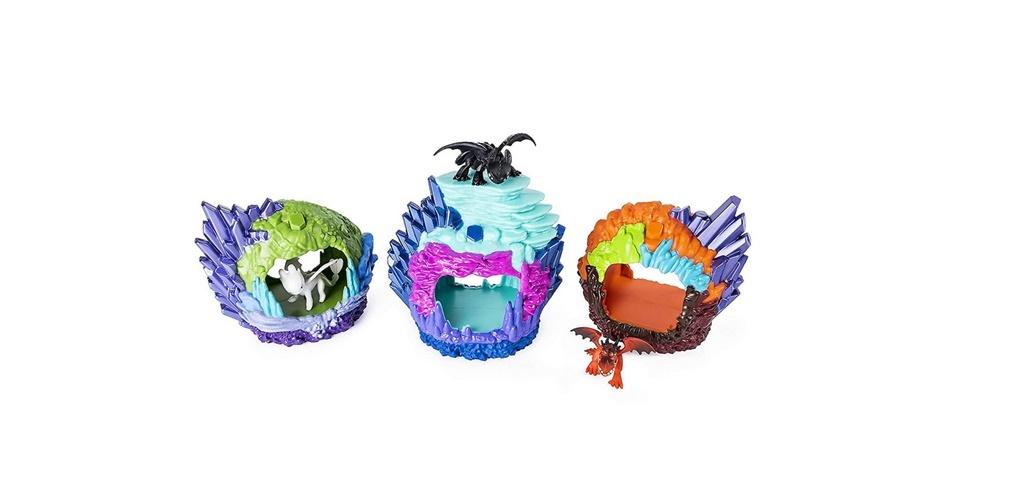 Wejdź w świat smoków i odtwarzaj ulubione sceny z filmu Jak wytresować smoka: Ukryty świat. Dzięki zestawom ukrytych światów zabawa będzie jeszcze bardziej wiarygodna! Każdy zestaw zawiera kolorową jaskinię wraz z figurką Smoka. Naciśnij przycisk w kształcie kamienia, aby aktywować światło UV, które ujawni bioluminescencyjne łuski Twojego smoka.