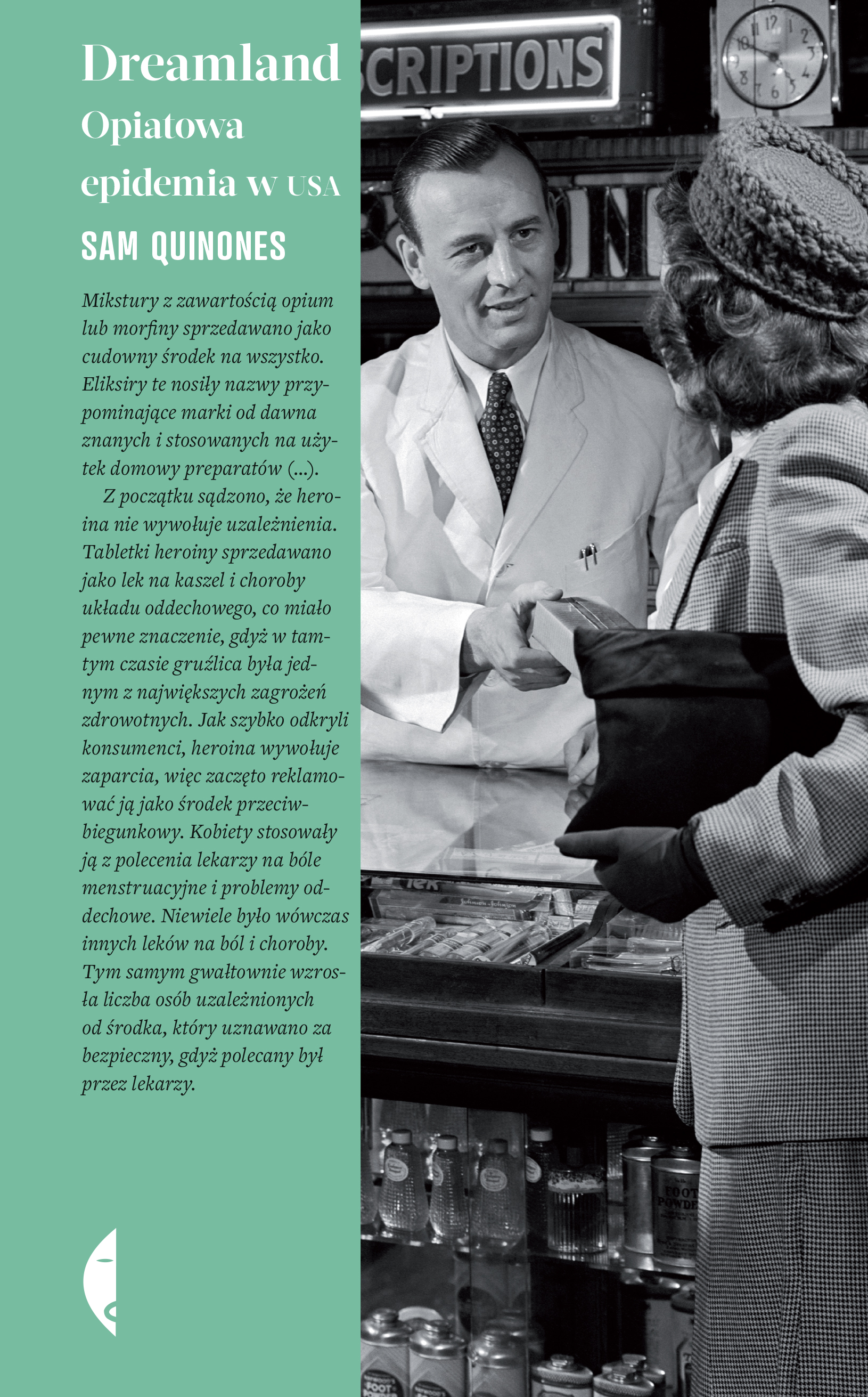 W 2008 roku w USA liczba zgonów w wyniku przedawkowania opiatów przewyższała liczbę ofiar wypadków samochodowych. Osób uzależnionych od leków z roku na rok jest coraz więcej, a rynek farmaceutyczny rośnie w siłę. Jak to możliwe, że legalnie dopuszczona do sprzedaży tabletka przeciwbólowa może doprowadzić do epidemii uzależnień? Sam Quinones drobiazgowo rekonstruuje dzieje tej opiatowej katastrofy. Z jednej strony rzetelnie przedstawia kolejne etapy wprowadzania niebezpiecznych leków do regularnej sprzedaży i pokazuje przeraźliwie krótką drogę od ukojenia bólu do nałogu, z drugiej zaś wprowadza nas w świat meksykańskich sprzedawców „czarnej smoły”, którzy korzystając z plagi uzależnień od opiatów, zajęli się sprzedażą heroiny, dostarczając ją pod drzwi narkomanów niczym dostawcy pizzy. Szefowie koncernów farmaceutycznych, dilerzy, policjanci, narkomani, rodzice tych, którzy przegrali z nałogiem. Bohaterów Dreamland jest wielu i to ich historie składają się na wstrząsająca opowieść o problemie, wobec którego Ameryka okazuje się bezradna. Książka nagrodzona Amerykańską Nagrodą Krytyków Literackich. „Quinones opowiada niesamowitą historię, której bohaterami są narkomani, przemytnicy, dilerzy, policjanci, prawnicy i dziesiątki rodzin dotkniętych problemem narkotykowym. Z wielką wnikliwością łączy i opisuje społeczny, polityczny i ekonomiczny wymiar uzależnienia, które zniszczyło środkowe Stany Zjednoczone, a co gorsza – rozprzestrzenia się dalej.” „Booklist” „Quinones jest doświadczonym reporterem i doskonałym przewodnikiem po amerykańsko-meksykańskim pograniczu […]. „Dreamland” to skrupulatne dziennikarstwo śledcze i zajmująca opowieść nie tylko o epidemii uzależnień od opiatów w USA, ale również o „negatywnej symbiozie” między Stanami Zjednoczonymi a ich południowym sąsiadem.” „New York Journal of Books” „Od losów ćpunów w Portland, przez nielegalne „fabryki recept” w Appalachach, aż po życiorysy przemytników heroiny z małego meksykańskiego miasteczka – Quinones opisuje „katastrofalną synergię” i nieuchronny łańcuch wydarzeń, gdy niewinne przepisanie leku przeciwbólowego prowadzi do uzależnienia od opiatów, a to często kończy się uzależnieniem od tańszej i paradoksalnie lepiej dostępnej heroiny. Jedna z najlepszych książek tego roku.” „Boston Globe”