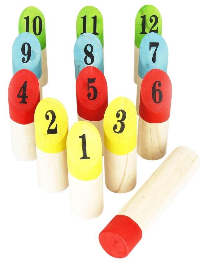 Zawiera 12 numerowanych klocków i pałkę do przewracania
