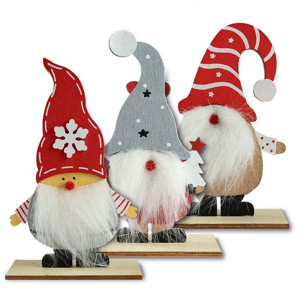 Drewniana stojąca dekoracja świąteczna w kształcie skrzata. Skrzat ma białą puchatą brodę i dużą czapkę. Idealna ozdoba do domu lub pomysł na upominek. Wysokość skrzata to 14,5 cm.