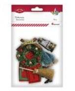 drzwi 66x100mm, miotła 100mm, drabina 20x60mm, okno 31x46mm, wycieraczka 35x54mm, wianek 75mm, choinki 25x48/28x65mm, lampa naftowa 37x55mm, para kaloszy 11x31x25mm