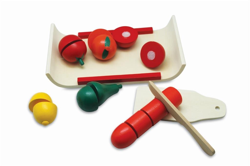 Zabawka drewniana - deska z warzywami i owocami. Elementy mają rzepy do łatwego przytwierdzania wybranych części. Zabawka pobudza kreatywne myślenie dziecka. Zawiera 14 połówek warzyw i owoców, drewniany nożyk, deseczkę małą oraz tacę. Wiek 3+