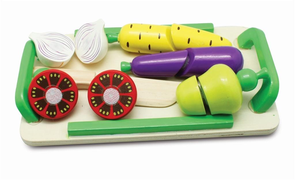 Zabawka drewniana - deska z warzywami. Elementy mają rzepy do łatwego przytwierdzania wybranych części. Zabawka pobudza kreatywne myślenie dziecka. Zawiera 10 połówek warzyw, drewniany nożyk oraz deskę. Wiek 3+