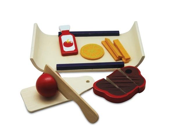 Zabawka drewniana - deska ze stekiem. Elementy mają rzepy do łatwego przytwierdzania wybranych części. Zabawka pobudza kreatywne myślenie dziecka. Zawiera 11 elementów do przygotowania steka, drewniany nożyk, małą deseczkę oraz tacę. Wiek 3+