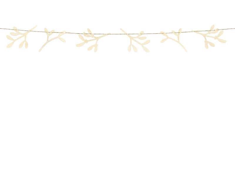 Girlanda Jemioła wykonana z drewna, zestaw zawiera 3 wzory gałązek, po 2 z każdego wzoru oraz ok. 2 m lnianego sznurka, wymiary po złożeniu: długość ok. 127 cm, wysokość ok. 10,5 cm. Produkt do samodzielengo złożenia.
