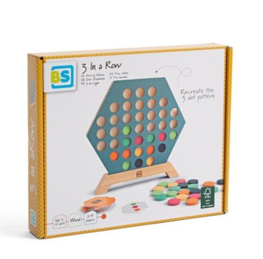 Drewniana gra 3 w rzędzie to trudniejsza i troszkę zmodyfikowana wersja popularnej gry 4 w rzędzie. Celem graczy jest odwzorować układ kropek z karty w ramie z otworkami.