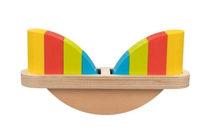 Dwie tęcze naprzeciwko siebie? To niespotykane! Wyjątkowy układ klocków tworzy jednocześnie sympatyczną huśtawkę, dzięki której pojęcia równowagi i siły ciężkości będą towarzyszami zabaw dziecka. Klocki różnej wielkości, koloru i ciężaru tej mini układanki są elementami, które nadadzą zabawie różnorodności, kiedy zaczniemy je np. grupować według różnych cech i obserwować, co z tego wynika.