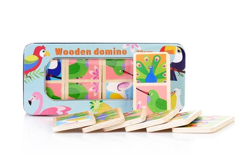 Gra polega na ułożeniu wszystkich klocków łacząc je w pary, wygrywa ten kto pozbędzie się domina, w zestawie: metalowe pudełko, 28 drewnianych kostek domino, wym. Opk: 18,5 x 8 x 4,5 cm., 2+