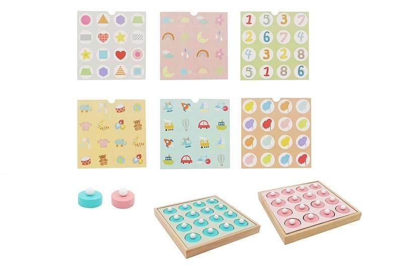 Gra polega na dopasowaniu obrazków w pary, w zestawie: drewniana forma, 6 plansz o różnej tematyce, 16 klocków do odkrywania, 2 kolory: miętowy, różowy, wym. Opk: 20,5 x 20,5 x 2,2 cm, 3+