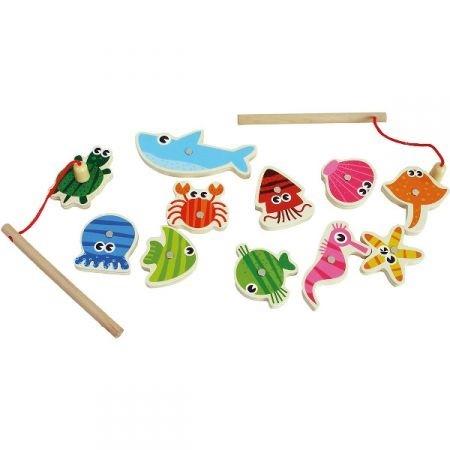 Gra zręcznościowa łowienie rybek to wspaniała zabawa dla dwójki dzieci lub dziecka i rodzica. Można się w nią bawić podczas kąpieli w wannie lub w ogrodowym basenie. Zestaw zawiera 11 drewnianych zwierzątek morskich w pięknych kolorach, 2 drewniane wędki zakończone są magnesem, za pomocą którego można łowić rybki. Gra ćwiczy koordynację ruchową, wspiera relację ręka-oko, uczy cierpliwości i skupienia.