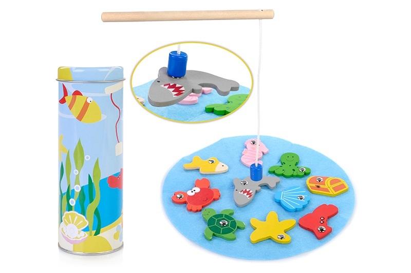 W zestawie: metalowy pojemnik na rybki, 2 wędki z magnesem, plansza, 10 rybek, wym. Opk: 6,2 x 6,2 x 16,6 cm., 3+