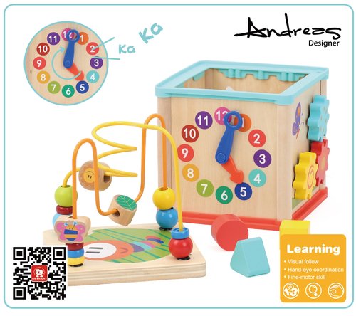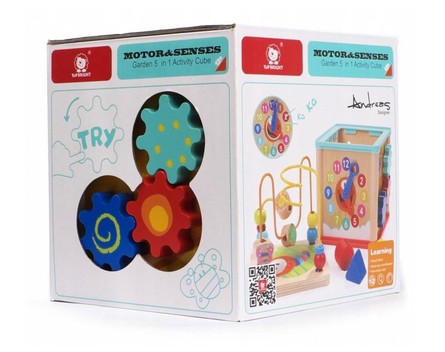 Kostka jest zabawką rozwijającą podstawowe obszary umiejętności dziecka. Każda ze ścian ma do zaoferowania maluszkowi inny rodzaj edukacyjnej aktywności - sorter, obrotowe kółka zębate, zegar, labirynt, przeplatanka koralikowa. Dodatkową atrakcją są wesołe kolorowe grafiki z pszczółkami na każdej ze ścian. Zabawka wspomaga rozwój koordynacji wzrokowo-ruchowej, rozpoznawania kolorów oraz kojarzenia kształtów. Wymiar zabawki: 15x30x15cm. Wymiar opakowania: 17x17x17cm. Zabawka przeznaczona dla dzieci: 18M+.