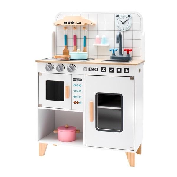 Drewniana kuchnia dla dzieci Baby Mix w stylu duńskim zachwyci zarówno małych kucharzy, jak i rodziców. Dzięki eleganckiemu designowi idealnie wpasuje się w każde wnętrze. Kuchnia została wykonana z wysokiej jakości drewna i oferuje dużo miejsca do przechowywania, co czyni ją nie tylko stylowym, ale również praktycznym dodatkiem do dziecięcego pokoju. Kuchnia posiada otwierane półeczki, przestronną piekarnik oraz płytę indukcyjną, na której dzieci mogą przygotowywać "pyszne" potrawy. Nie zabrakło również zlewu z obracanymi kranami, który dodaje zabawie realizmu. W zestawie znajduje się drewniana patelnia z pokrywką, garnek oraz przybory kuchenne, takie jak łopatki i łyżki. Dopełnieniem zabawy są drewniane solniczka i pieprzniczka. Design kuchni uzupełnia stylowy okap, zegar z ruchomymi wskazówkami oraz praktyczne haczyki na przybory. Wymiary: - Wysokość całkowita kuchni: 85 cm - Wysokość blatu od podłogi: 55,5 cm - Szerokość kuchni: 60 cm - Głębokość kuchni: 28 cm - Wymiary opakowania: 86 17 38 cm Drewniana kuchnia dla dzieci Baby Mix w stylu duńskim to doskonały wybór dla kreatywnej i pełnej zabawy, która rozwija wyobraźnię i zdolności manualne Twojego dziecka. Uwagi dotyczące bezpieczeństwa: - Przeznaczone dla dzieci od 3 lat. - Wykonane z drewna i plastiku. - Czyszczenie: używać wilgotnej szmatki. - Produkt spełnia normy EN 71-1, EN 71-2 i EN 71-3.