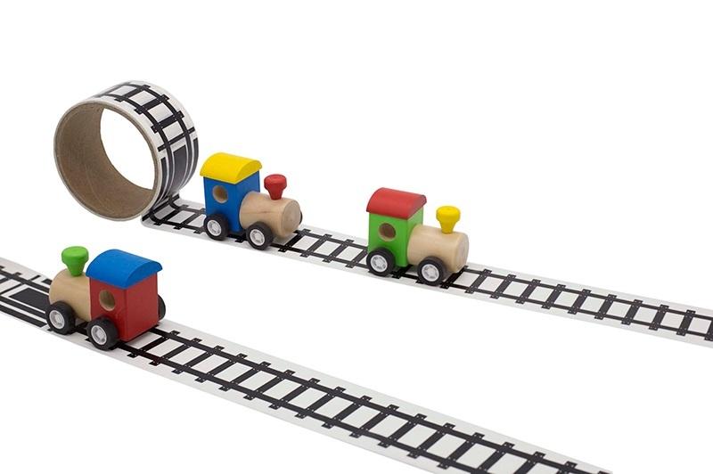 W zestawie: drewniana lokomotywa, tor w formie taśmy samoprzylepnej 8 m., W kolory: czerwony, zielony, niebieski, wym. Opk. 9,5 x 5.5 x 9,5 cm., 3+