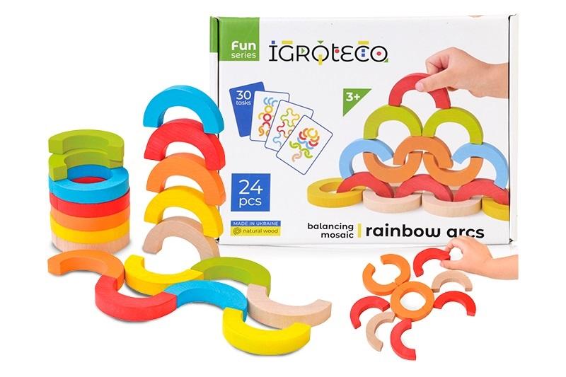 W zestawie: 24 drewniane elementy w kształcie łuków w różnych kolorach, instrukcja z 30 schematami, wym. Opk: 21 x 17 x 6 cm., 3+