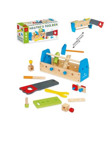 Duża drewniana skrzynka z narzędziami to idealny początek przygody dla małego majsterkowicza. W zestawie znajdują się precyzyjnie wykonane narzędzia oraz niezbędne podkładki, śrubki, gwinty. Wszystkie elementy są ze sobą kompatybilne i doskonale sprawdzą się w budowaniu, skręcaniu i odkręcaniu. Skrzynię również możemy wykorzystać w tym celu. Znajdują się w niej specjalne otworki. Samodzielne budowanie wspaniale wpływa na kreatywność i ćwiczenia manualne małych rączek. Uczy także cierpliwości oraz ćwiczy koncentrację uwagi.