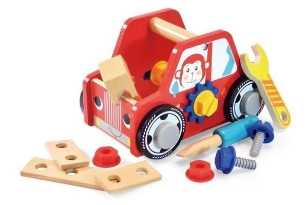 W zestawie: skrzynka na narzędzia w kształcie auta, klucz, śrubokręt, deseczki, nakrętki, śrubki.