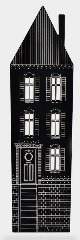 Kamieniczka z jednej strony jest pokryta farbą tablicową i posiada wygrawerowane elementy, z drugiej natomiast jest biała.