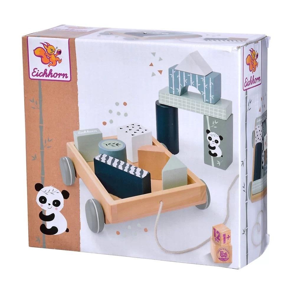 Drewniana taczka, posiada ruchome koła, do zestawu dołączone 11 drewnianych klocków, które wyróżnia estetyczna, błękitno-szara kolorystyka, wykonane z drewna brzozowego, Wymiary taczki: 18 x 17,5 cm.