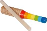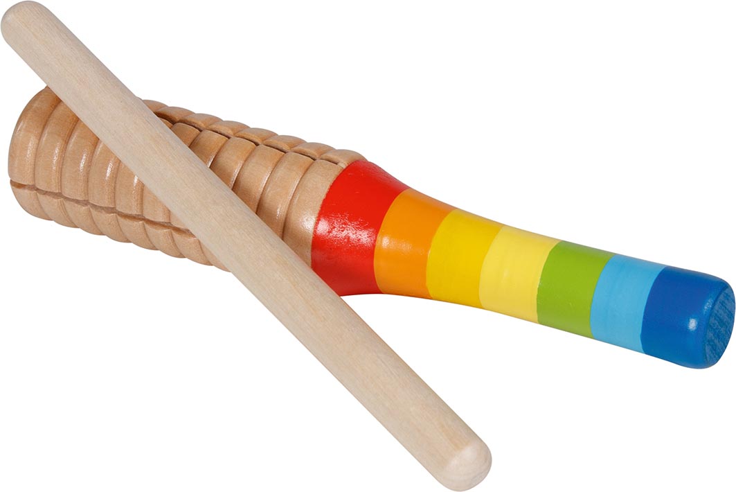 Tarka wykonana jest z solidnego drewna i posiada kolorową, tęczową rączkę - uchwyt, co sprawia, że jest przyjemna w dotyku i łatwa w trzymaniu nawet dla najmłodszych rączek. Dzięki swojej prostocie obsługi, każde dziecko może szybko nauczyć się grać na tym instrumencie i cieszyć się tworzeniem różnorodnych dźwięków.