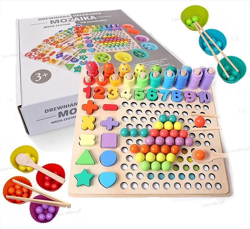 UCZY Zabawa z mozaiką to świetny sposób na rozwijanie zdolności manualnych, zręczności, ćwiczenie koordynacji wzrokowo-ruchowej oraz praktykowanie zdolności logicznego myślenia. Z zabawką dzieci ćwiczą również cierpliwość i koncentrację. Drewniana układanka koraliki bardzo dobrze sprawdzi się również przy nauce liczb, ponadto może okazać się pomocna przy wykonywaniu prostych działań matematycznych. Z jej pomocą dziecko szybko nauczy się rozpoznawać kolory oraz tworzyć figury geometryczne z koralików.