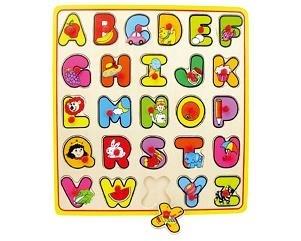 Nauka przez zabawę - układanka drewniana z pinezkami Literki 25 elementów. Dla dzieci w wieku od 10 miesięcy