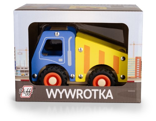 Drewniane auto z oponami - Wywrotka Drewniany pojazd budowlany rozbudzi ciekawość i chęć zabawy każdego dziecka. Wywrotka malowana bezpieczną na dzieci farbą, opony wykonane są z miękkiej gumy. Produkt zgodny z Europejską normą dotyczącą bezpieczeństwa zabawek. Kwalifikacja wiekowa +3 mcy Marka: Daffi Indeks: D-135 Wielkość: 18x13x11 cm EAN: 5905422041356