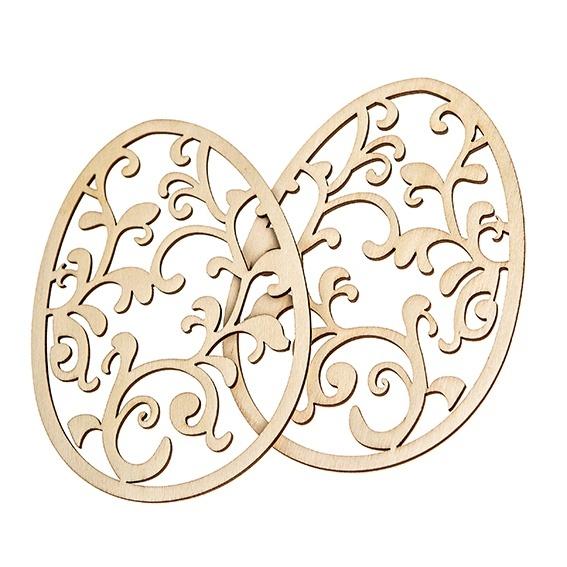 Drewniane ażurowe jajka w naturalnym kolorze, to świetny dodatek do wielkanocnych prac kreatywnych. W opakowaniu znajdziemy dwa jajka z ażurowymi roślinnymi, ozdobnymi motywami.