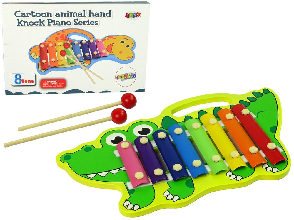 Żywa kolorystyka i wielkości pobudzają zmysł wzroku, dając mu radość z efektów swojej nowej zabawy. Cymbałki posiadają 8 tonów, które kolejno posiadają różne kolory. Dziecko uderza w nie pałeczkami, dzięki czemu z instrumentu wydobywa się przyjemny dźwięk, pobudzający słuch. Dziecko może z łatwością zapamiętać grane utwory, nauczyć się rozpoznawania kolorów. Obudowa ucieszy każdego małego fana zwierzaków i bajek. Ma ona kolor zielony w kształcie uśmiechniętego krokodyla.