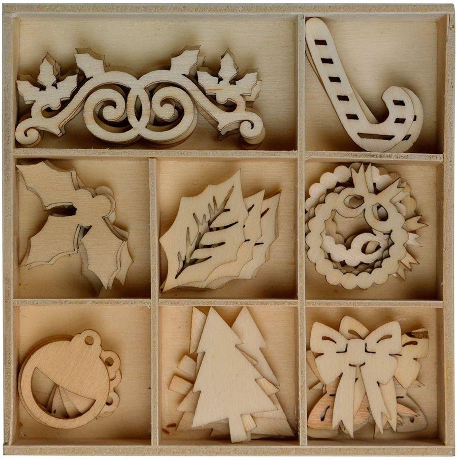 Drewniane elementy dekoracyjne świetnie nadają się do tworzenia zaproszeń, kartek okolicznościowych, pamiętników czy ozdób świątecznych. Można wykorzystać je do wykańczania wnętrz: zdobienia mebli, luster, okien, firan, przedmiotów wiklinowych oraz innych prac dekoratorskich. Stanowią doskonałe uzupełnienie dla techniki decoupage i scrapbooking. 9 wzorów w drewnianym pudełku o wymiarach 10,5 x 10,5 cm. Kształty: dekor, laska cukrowa, liść ostrokrzewu, liść, wianek, bombka, choinka, kokarda. 40 szt. kolor: naturalna