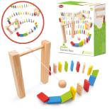 Przepiękne, drewniane domino o przeznaczeniu konstrukcyjnym.To kompletny zestaw pozwalający budować tory z domina o przeróżnych kształtach, które później należy przewracać. Opakowanie to zestaw 200 kostek domina, w przeróżnych kolorach, które wykonane zostały z drewna. W zestawie znajdują się także elementy urozmaicające budowanie toru, takie jak mostek, schody dla domina czy obrotowe koło dla kostek. Tak bogaty zestaw daje wręcz nieograniczone tworzenie torów, a kupno kilku zestawów znacząco zwiększa możliwości konstrukcyjne. Estetyczne pudełko o szerokości 24cm pozwala na przechowywanie wszystkich elementów wchodzących w skład zestawu
