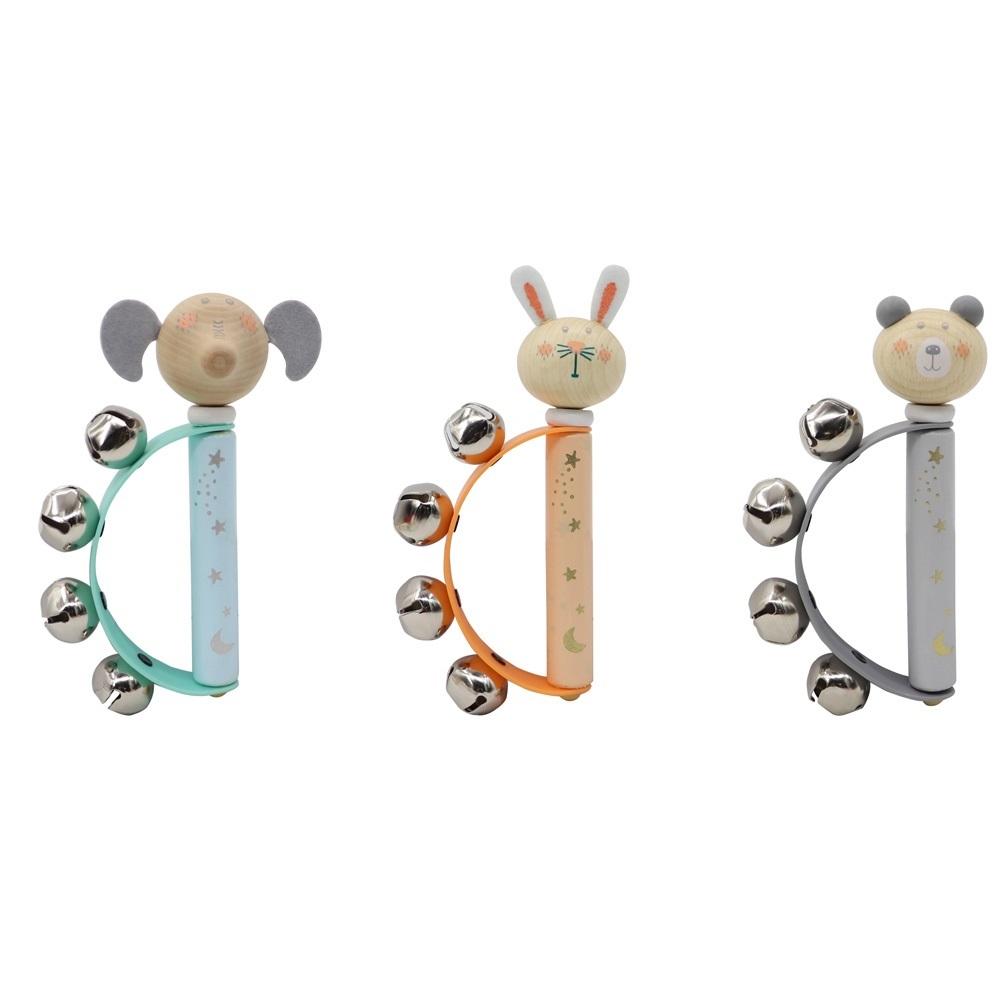 JANCZARY Metalowe dzwoneczki na drewnianym uchwycie , zakończonym główką z podobizną zwierzątka 3 wzory w pastelowych kolorach. Idealne do tańców, zabaw i na rytmikę, wprowadzą dziecko w świat muzyki. wiek 3+ wymiary display'a: 21 x 15 x 18(+8) cm