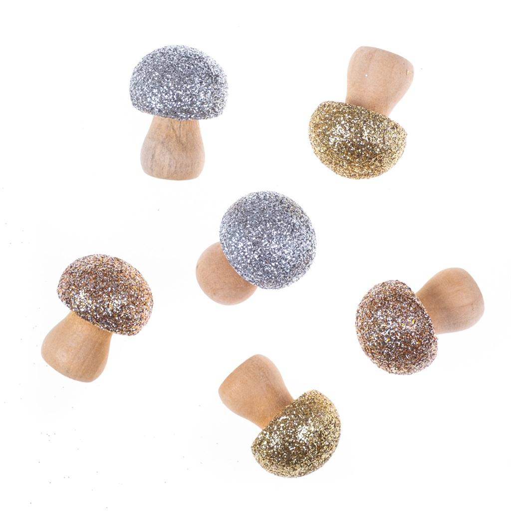 Drewniane grzybki z kapeluszami pokrytymi brokatem w kolorze srebrnym, złotym i różowego złota to oryginalny dodatek do projektów świątecznych, jesiennych i całorocznych.