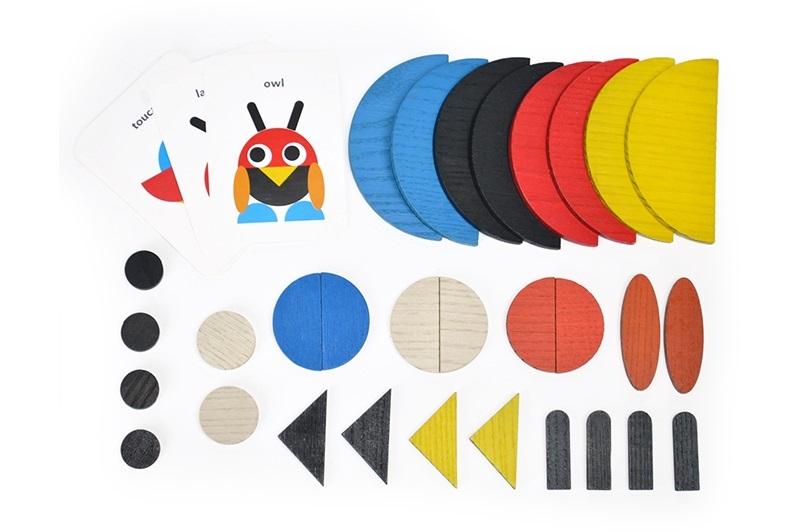 W zestawie: 30 drewnianych elementów w różnych kształtach i kolorach do układania, 10 dwustronnych kolorowych kart z wzorami: zwierząt, przedmiotów, wym. Opk: 21,5 x 5,5 x 16,5 cm., 3+