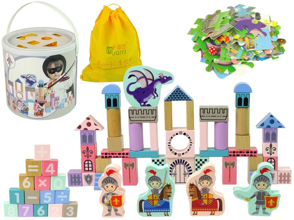 Zestaw sprawi, że dziecko pozna kształty oraz figury geometryczne, a przy tym doskonale będzie się bawić. Klocki zawierają różne nadruki, takie jak bramy, mury, rycerze i wielki smok. Klocki zapakowane są w kolorowe wiaderko na górze, którego znajdują się otwory w różnych kształtach, do których należy dopasować odpowiednie klocki. Zamek królewski pilnuje ogromny smok, który broni dostępu do wrót. Rycerze na koniach i pieszo z wielkimi tarczami i mieczami, bronią murów stworzonego przez Twojego dziecko zamku. To tylko jeden ze scenariuszy zabaw, maluch pobudzi wyobraźnie. Kolejną zaletą są liczby i znaki dołączone do zestawu, oprócz zabawy też czas na naukę. Działania, liczenie nie będzie sprawiało już problemu.