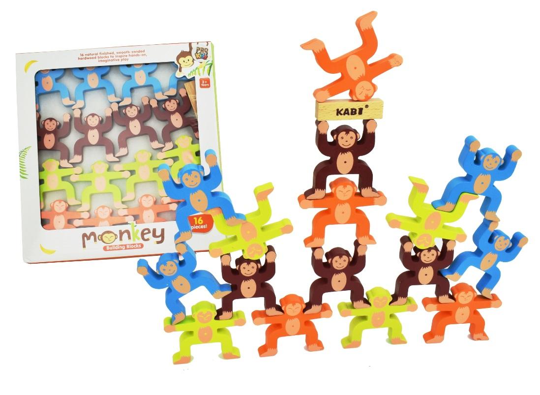 Zestaw składa się z 16 drewnianych różnokolorowych małpek. Zabawka wspomaga rozwój intelektualny i motoryczny dziecka. Możliwość zabawy lub gry dla wielu osób.