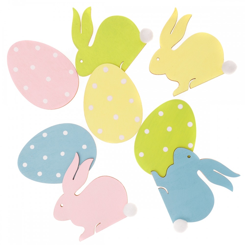 Opakowanie Drewniane pastelowe króliczki i jajka 7 cm 8 szt.