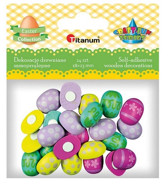 Drewniane pisanki 18 x 23 mm na piance samoprzylepnej 3D, 24 szt., kolory: fuksja, fiolet, żółty, morski.