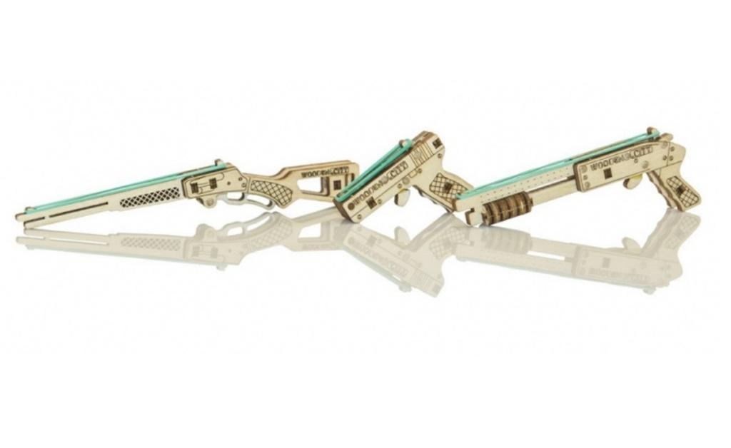 Puzzle 3D wykonane z ekologicznej sklejki. Zestaw trzech mini pistoletów do własnoręcznego wykonania. Zabawka nie wymaga użycia kleju.