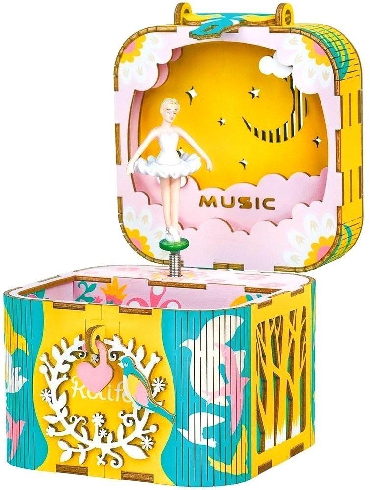 Drewniane Puzzle 3D – Pozytywka Balet Kolorowe puzzle 3D z pozytywką, wykonane z wysokiej jakości sklejki. Model posiada mechanizm, który po nakręceniu odtworzy melodię oraz sprawi, że baletnica zacznie się obracać. Zestaw ma postać arkuszy z wstępnie wyciętymi i ponumerowanymi elementami, które przed montażem należy oddzielić od wykroju, a następnie połączyć zgodnie ze szczegółową instrukcją dołączoną do opakowania.