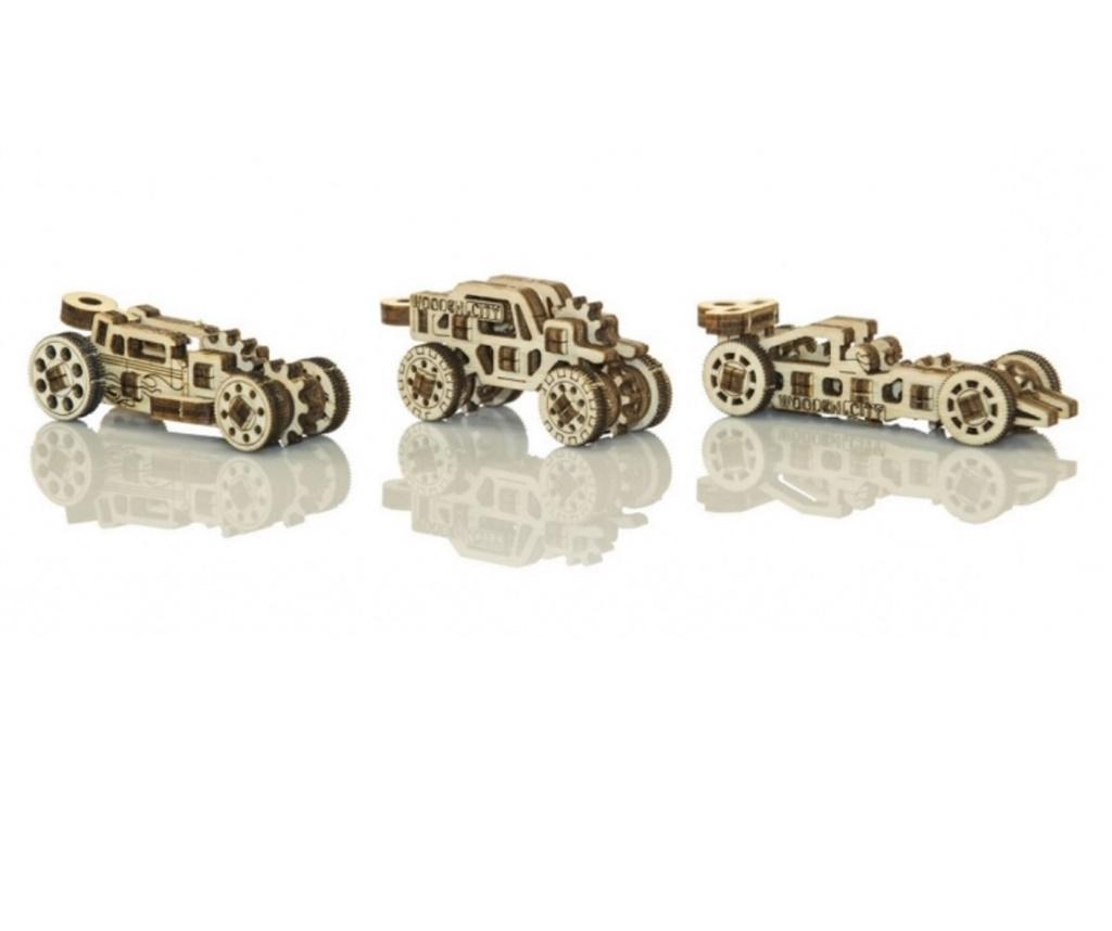 Puzzle 3D wykonane z ekologicznej sklejki. Zestaw trzech mini samochodów wyścigowych do własnoręcznego wykonania. Zabawka nie wymaga użycia kleju.