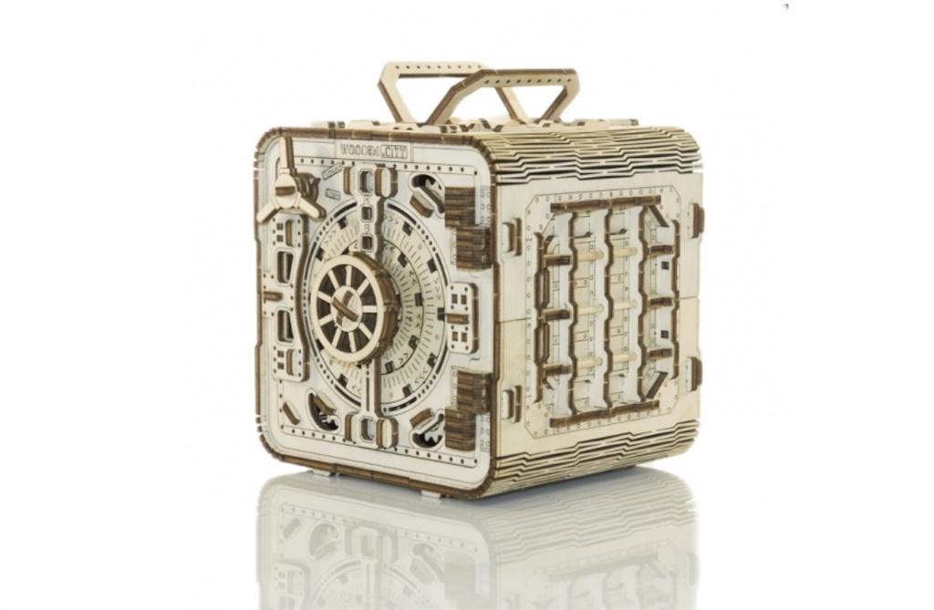 Puzzle 3D wykonane z ekologicznej sklejki. Sejf do własnoręcznego składania, posiada ruchome elementy i daje możliowść zamknięcia go na swój własny unikalny kod. Zabawka nie wymaga użycia kleju.