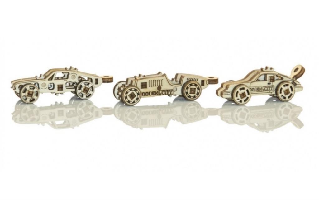 Puzzle 3D wykonane z ekologicznej sklejki. Modele trzech mini sportowych samochodów do własnoręcznego złożenia. Zabawka nie wymaga użycia kleju.
