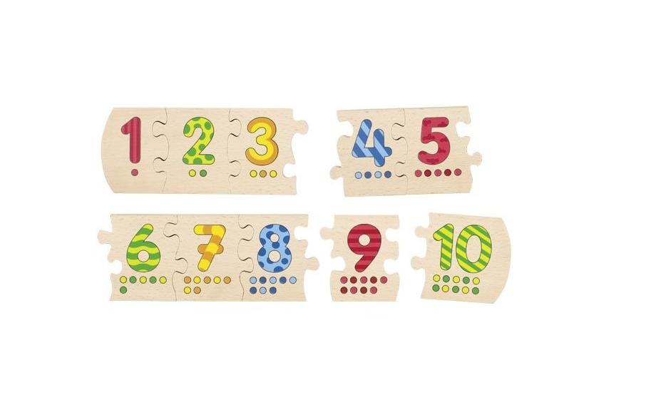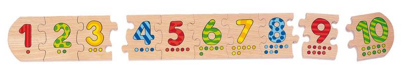 Puzzle Cyfry pomogą Twojemu dziecku przez zabawę poznać cyfry. Każdy puzzel to inna liczba od 1 – 10. Dziecko, które dopiero uczy się liczb, nie zna jeszcze ich kolejności, więc puzzle będą dla niego wspaniałą nauką. Ponadto pod liczbą znajdują się namalowane kółeczka, które odpowiadają cyfrze na danej części, więc dziecko licząc kółeczka będzie wiedzieć, ile to np. siedem - tzn. przejdzie z myślenia konkretno-obrazowego do myślenia abstrakcyjnego. Zawartość: - 10 części puzzli wykonane z drewna bukowego, lakierowane oraz malowane - wymiar jednego puzzla 7 x 6,5 cm - długość puzzli 52 cm