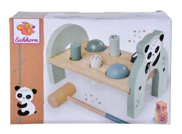Drewniane stanowisko do wbijania klocków wyposażone jest w drewniany młotek i 6 elementów do wbijania (4 klocki i 2 kulki), uwagę zwraca grafika z uroczym misiem pandą w estetycznej, błękitno-szarej kolorystyce.Wykonane z drewna brzozowego i MDF, wymiary zabawki: 23 x 12,5x14,5 cm.